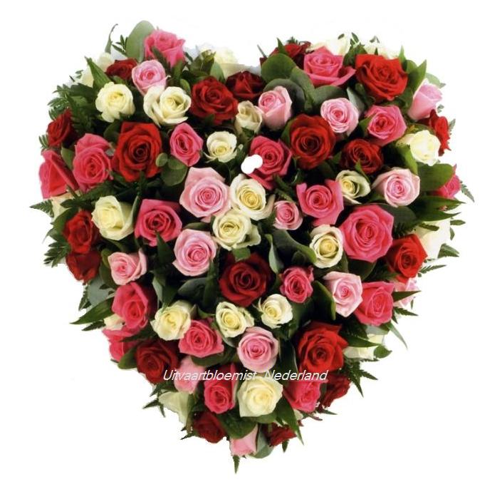 Rouwhart model opgemaakt met gemengde rozen aangevuld met groen. Een schitterend rouwarrangement.