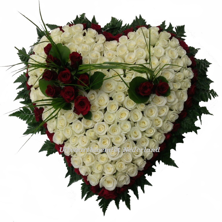 Uitvaartbloemist Amsterdam de bloemenstylist op het gebied van rouwbloemen maakt de meest speciale en stijlvolle rouwharten. Dit rouwhart is opgemaakt met mooie witte rozen aangevuld met groen. In het rouwhart zijn nog losse toefjes rode rozen gestoken. Ondanks al het verdriet toch een liefdevolle uitstraling en is voor vele uitvaarten geschikt. Een excellent rouwarrangement.