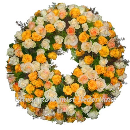 Rouwkrans geheel gevuld met geel en creme/witte bloemen. Meestal worden er rozen gebruikt in combinatie met andere bloemen aangevuld met groen.