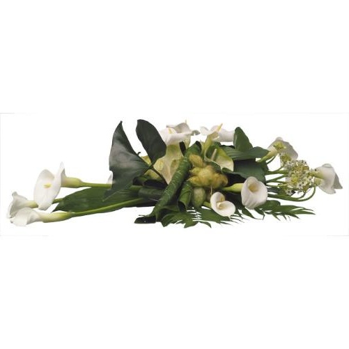 Ook dit rouwstuk met super mooie calla’s opgemaakt met stijlvol blad en andere soorten bloemen en blad materiaal.